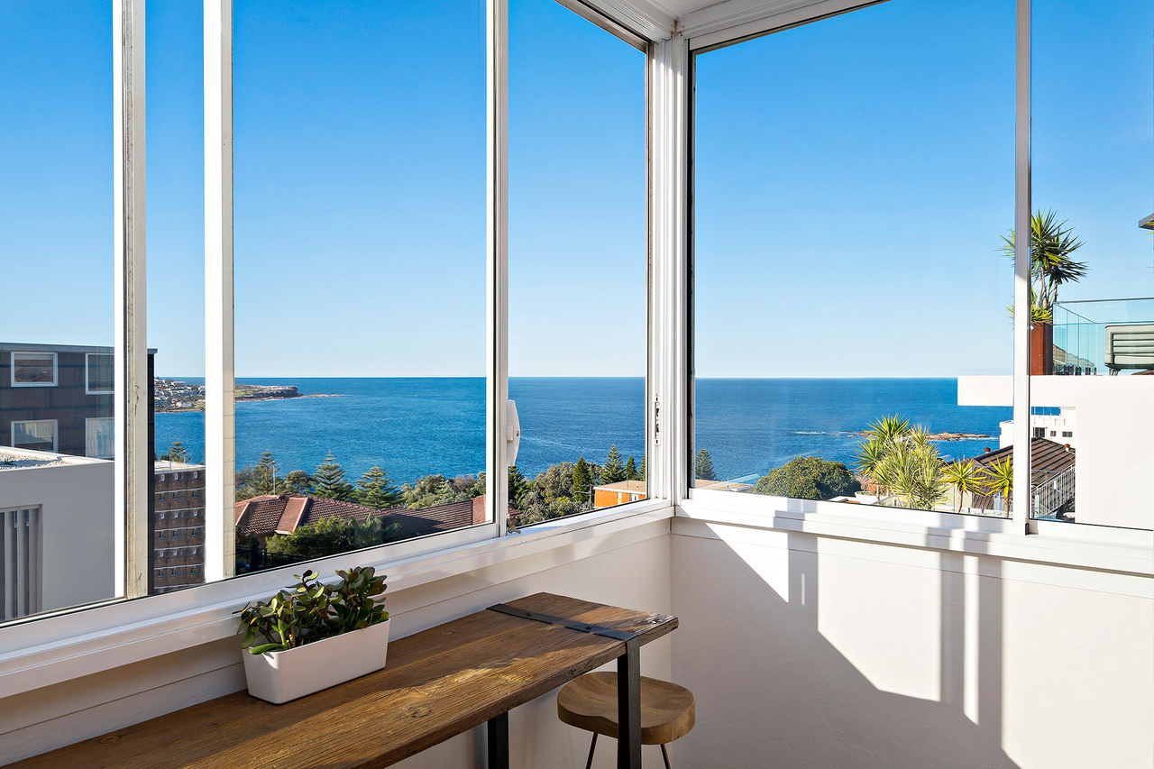Privately and peacefully set well back from the street high in a boutique block of just nine, this exceptional residence opens to embrace spectacular never-to-be-built out ocean and coastline views. Flooded with the light of a due northern perspective, this immaculate designer apartment is presented to the market for the first time in three decades. • Beautifully crafted with an exacting attention to detail • Expansive entertaining with open plan lounge and dining • Generous interiors with only one minor common wall • Well proportioned sunroom, cooled by summer breezes • Spacious double bedrooms with built-ins, study alcove • Deluxe kitchen, Quantum Quartz benches, Miele appliances • With high ceilings, plantation shutters, bamboo floors • Stylish bathroom with bath and frameless glass shower • Guest w/c, single garage, intercom and internal laundry • A stroll to Coogee Beach, Wylie's Baths, parks and buses
