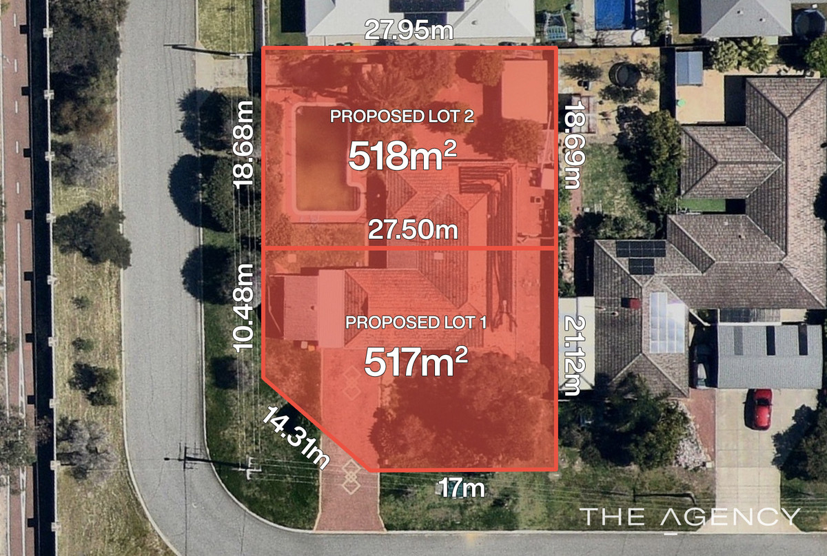TWO “SUPER-SIZED” PROPOSED LOTS NOW FOR SALE – CONTACT AGENT FOR FURTHER DETAILS AND A PRICE GUIDE. PROPOSED LOT 1 - 517 SQM - CORNER LOT PROPOSED LOT 2 - 518 SQM - 18+M FRONTAGE (UNDER OFFER) These SUPER-SIZED lots offer a rare chance to create the home you've always envisioned, with plenty of room to move. Building opportunities in this tightly held and sought-after suburb are few and far between, especially lots of this size. FAST FACTS: * Level sites * R20 Zoning / 50% plot ratio * Wide frontages – room to include a boat or caravan parking bay in your building design * Fully serviced lots with sewer, underground power, gas, and water services all available to connect * Design your home to enjoy a north facing alfresco and rear yard * Super-sized lots – room for a pool and back yard * Wide established verges, ideal for additional verge parking * "Buy Now, Pay Later" opportunity * Design your home and submit your building plans for approval in the lead up to settlement WHAT ABOUT THE LOCATION ......... Conveniently located in close proximity to Warwick Grove Shopping Centre, Glendale Primary School, Carine Glades Shopping Centre, Warwick Senior High School, Warwick Train Station, Carine Open Space, Karrinyup Shopping Centre, and a short drive down Beach Road to our beautiful Indian Ocean. The lifestyle on offer here is hard to beat! Seize this unique opportunity to secure your slice of Hamersley today - Your dream home awaits! Disclaimer: This information is provided for general information purposes only and is based on information provided by the Seller and may be subject to change. No warranty or representation is made as to its accuracy and interested parties should place no reliance on it and should make their own independent enquiries.